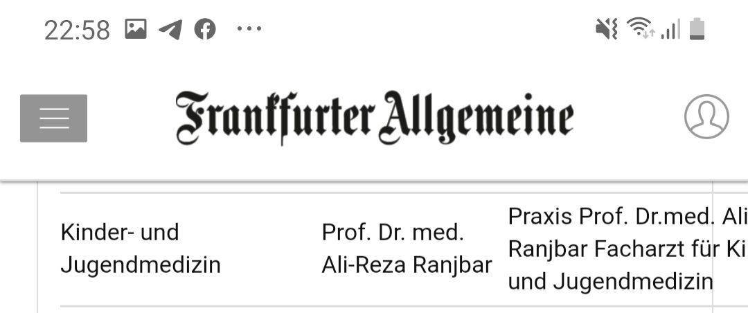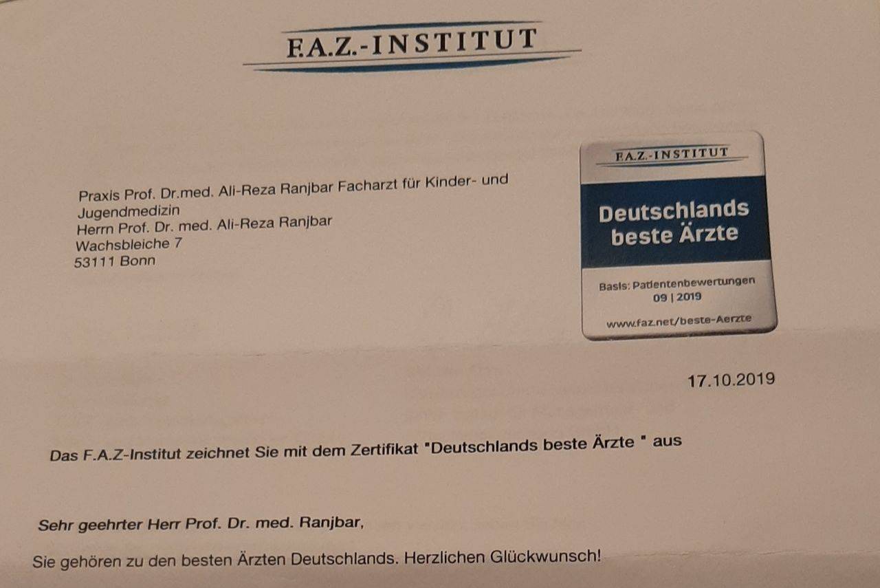انتخاب مجدد پروفسور دکتر علیرضا رنجبر، پزشک نامدار و برجسته ایرانی بهعنوان یکی از پزشکان برتر آسم و آلرژی کودکان و نوجوانان آلمان توسط انستیتوی معتبر F.A.Z